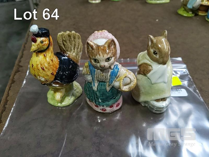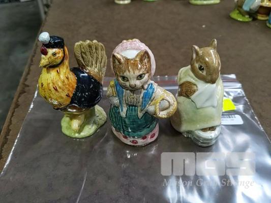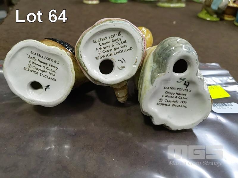 BEATRIX POTTER'S "SALLY HENNY PENNY" FIGURINE "F. WARNE & CO.LTD. (C) COPYRIGHT 1974 BESWICK ENGLAND" BEATRIX POTTER'S "COUSIN RIBBY" FIGURINE "F. WARNE & CO.LTD. (C) COPYRIGHT 1970 BESWICK ENGLAND" BEATRIX POTTER'S "CHIPPY HACKEE" FIGURINE "F. WARNE & CO.LTD. (C) COPYRIGHT 1979 BESWICK ENGLAND"