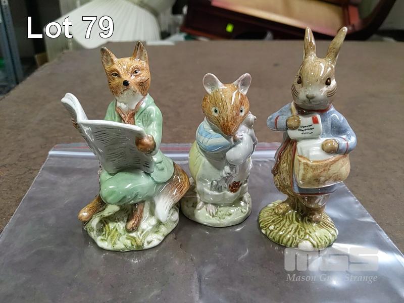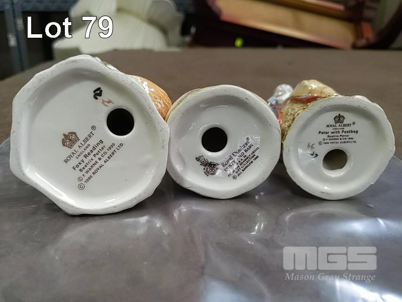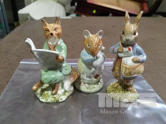 BEATRIX POTTER FIGURINE "FOXY READING", "ROYAL ALBERT ENGLAND ... BEATRIX POTTER (C) F.WARNE & CO.1990 (C)1990 ROYAL ALBERT LTD" BEATRIX POTTER FIGURINE "DUSTY AND BABY", "D.B.H. 26 FROM THE BRAMBLY HEDGE GIFT COLLECTION (C) JILL BARKLEM 1995" BEATRIX POTTER FIGURINE "PETER WITH POSTBAG", "ROYAL ALBERT ENGLAND ... BEATRIX POTTER (C) F.WARNE & CO.1996 (C)1996 ROYAL ALBERT LTD"
