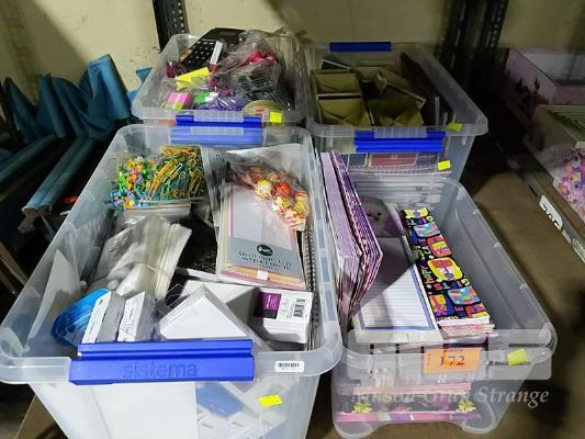 4 x TUBS OF ASSORTED HOME OFFICE SUPPLIES INCLUDING WRAPPING PAPER, PENS, NOTEPADS, PENCIL CUPS, CLIPS, TAPES, CALCULATORS AND MUCH MUCH MORE