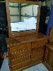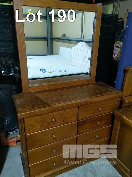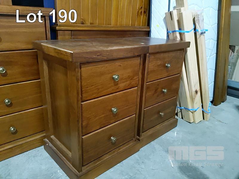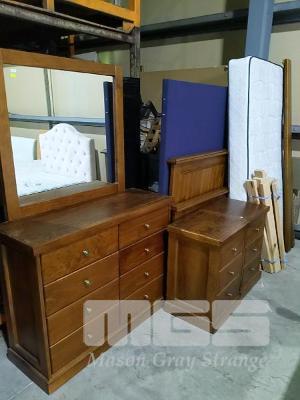 CONTEMPORARY TIMBER SINGLE BED BEDROOM SUITE INCLUDING SINGLE BED BASE AND MATTRESS, 8-DRAWER DRESSER WITH LARGE MIRROR AND 2 x 3-DRAWER BEDSIDE TABLES. ALL IN TEAK STAIN.