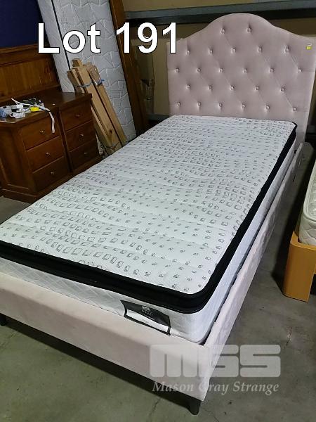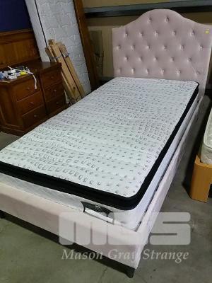 KING SINGLE BED FRAME AND SEALLY MATTRESS. ALL IN BLUSH PINK VELVET WITH TUFTED BUTTON HEADBOARD.