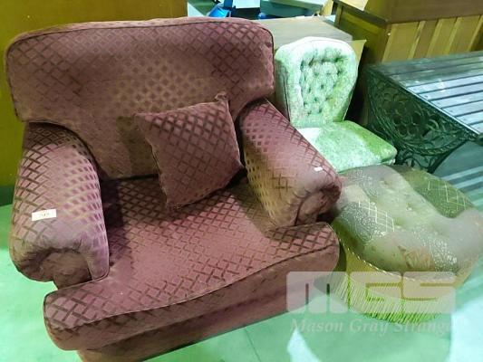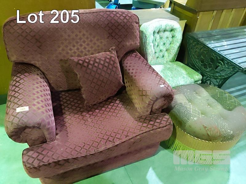 BURGUNDY FABRIC UPHOLSTERED, ROLL ARM, SINGLE ARM CHAIR, FLORAL PATTERN BEDROOM CHAIR & FOOT STOOL