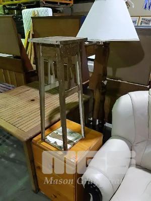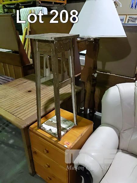 TURNED TIMBER STANDARD LAMP & SHADE, PLANTER PEDESTAL & 3 DRAWER BEDSIDE CABINET