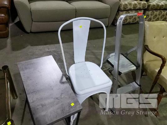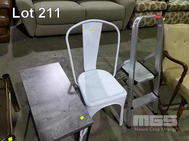 WHITE STEEL CHAIR, STEP LADDER AND SIDE TABLE