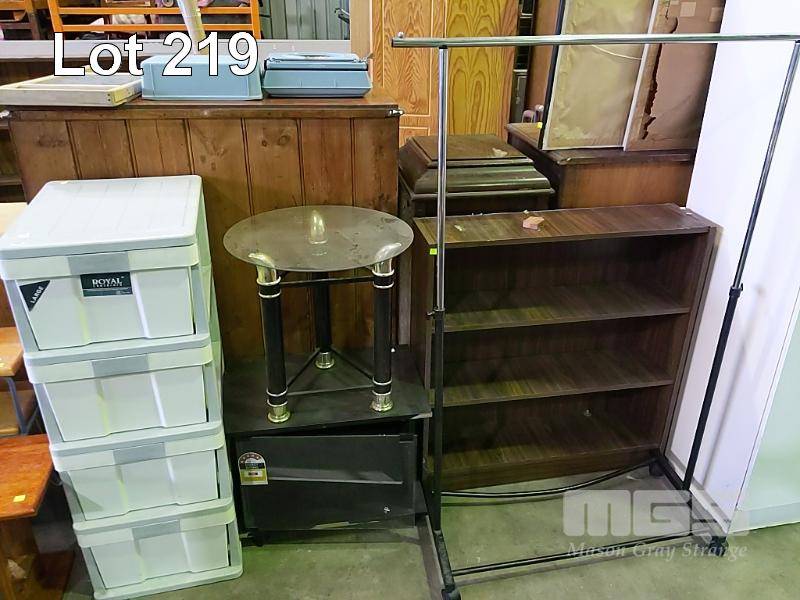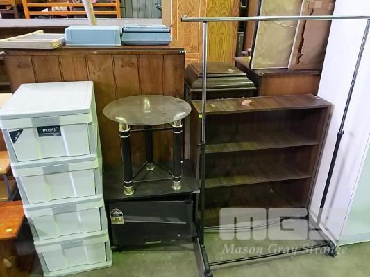 ROUND GLASS TOP SIDE TABLE, TV UNIT, LAMINATED BOOKSHELF AND 4-DRAWER PLASTIC STORAGE UNIT AND CLOTHING RACK.