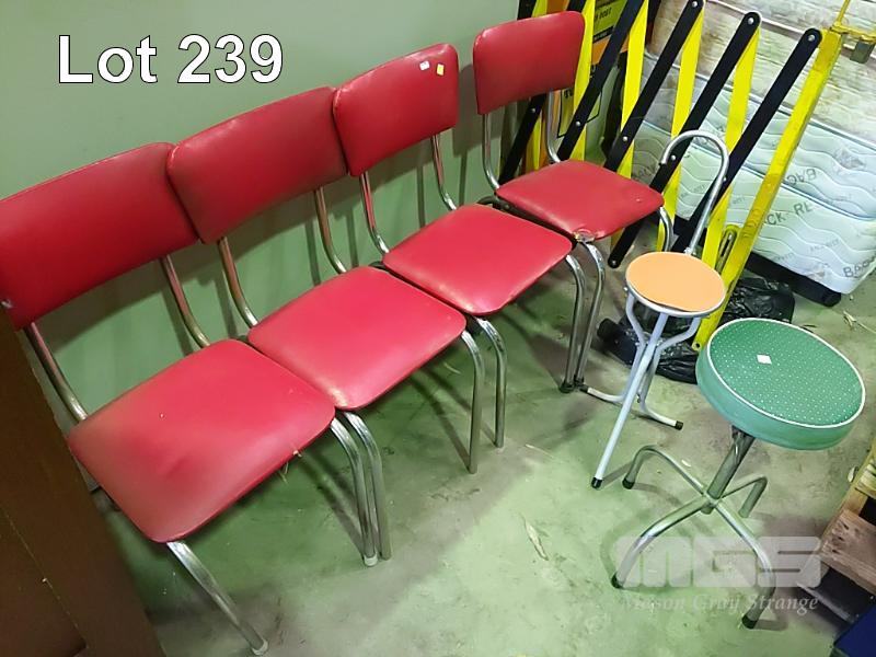 6 x MID CENTURY SEATS INCLUDING 4 x KITCHEN CHAIRS, ADJUSTABLE STOOL AND WALKING STICK FOLDING SEAT