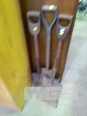 3 x VINTAGE GARDEN SHOVELS, INCLUDING 2 x WITH WOODEN HANDLES AND OLD PUSH LAWNMOWER (BROKEN - PARTS ONLY)