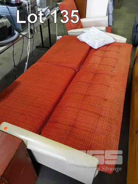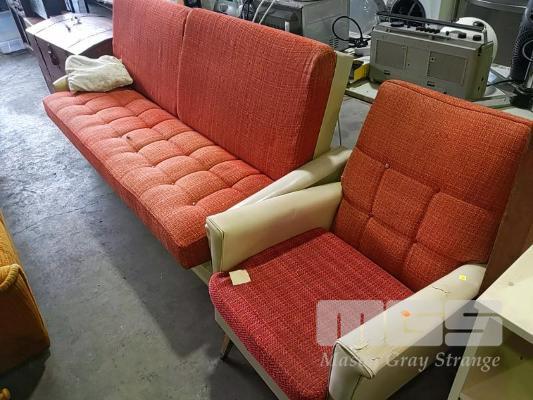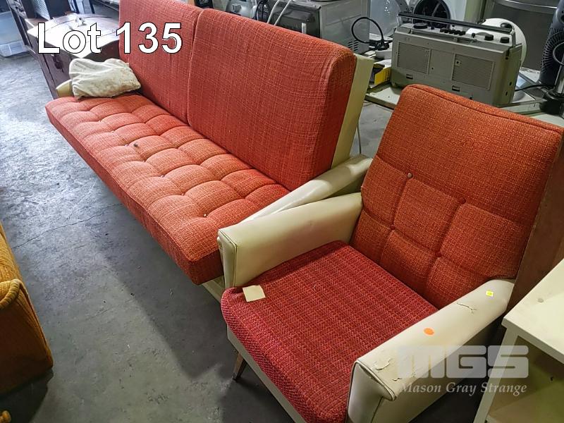MID CENTURY VINYL AND FABRIC 3-SEAT CLICK CLACK SOFA BED AND MATCHING ARMCHAIR.