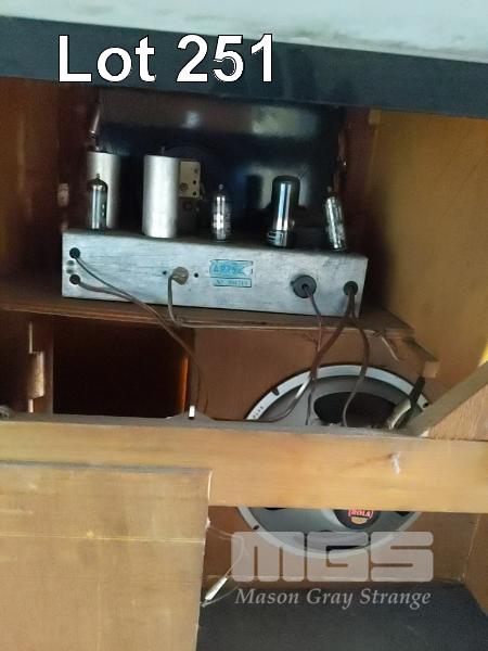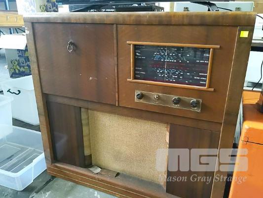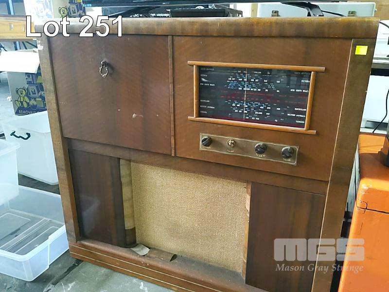 CLASSIC VINTAGE ART DECO RADIO/MUSIC CABINET. FEATURES VALVE RADIO AND LP RECORD PLAYER. SOME DELAMINATING AND VOLUME KNOB MISSING.