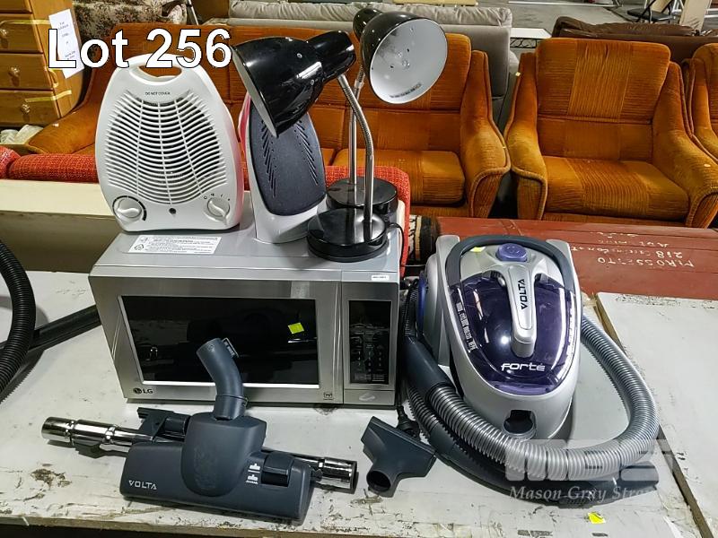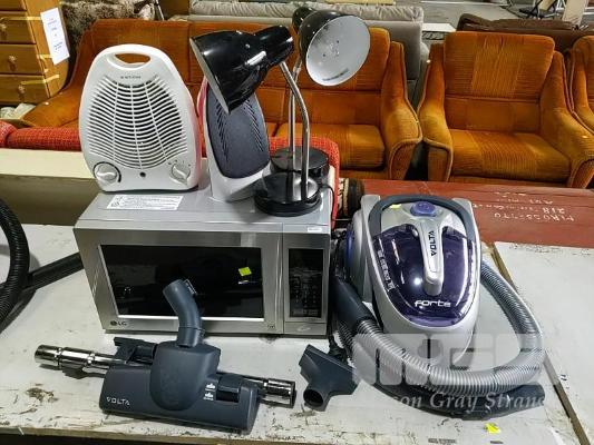 COLLECTION OF HOUSEHOLD ELECTRICAL INCLUDING VOLTA "FORTE" 1600W VACUUM CLEANER, LG MICROWAVE OVEN (MS204), PAIR OF BEDSIDE LAMPS, BLOW HEATER AND SUNBEAM "PROSTEAM" IRON.