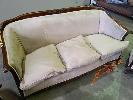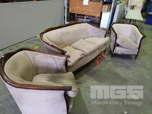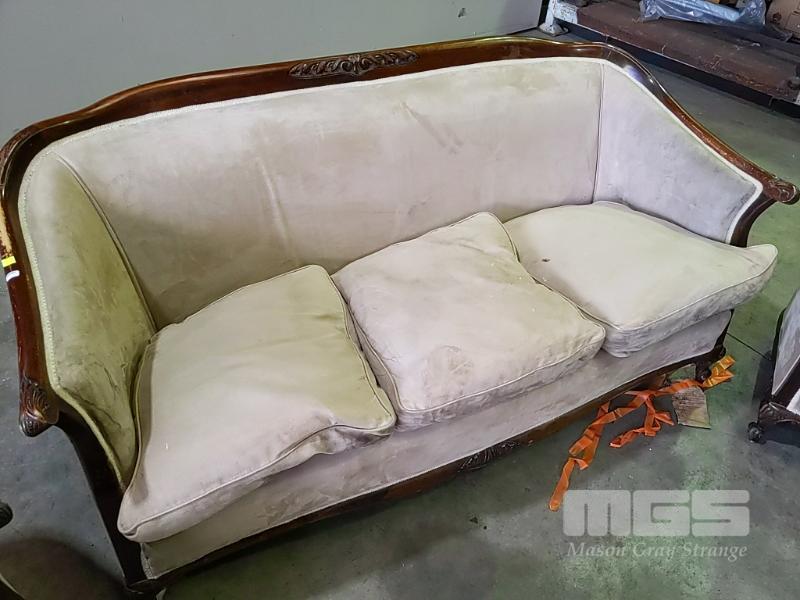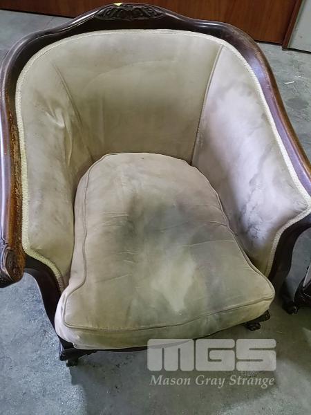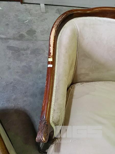 TIMBER FRAMED ANTIQUE LOUNGE SUITE 2-SEATER AND 2 x ARM CHAIRS (SOME SOILING AND SCRAPE MARKS)