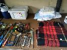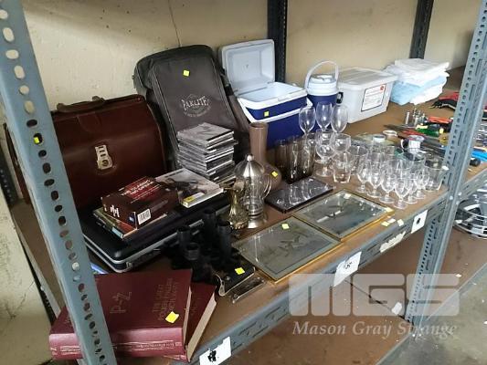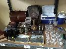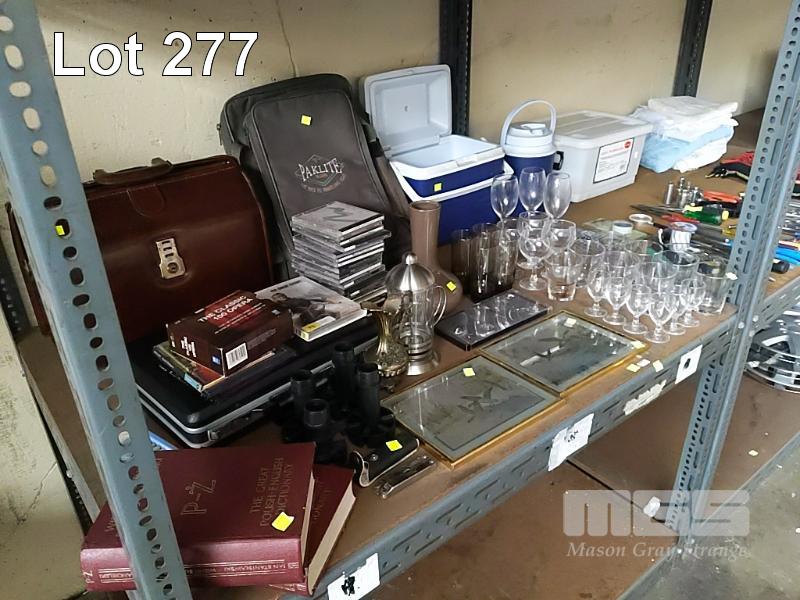 COLLECTION OF HOUSEHOLD ITEMS INCLUDING FOIL PICTURES, BRIEFCASES, BACKPACK, ORCHESTRAL CDS, GLASSWARE, TOOLKIT, BLANKET ETC
