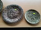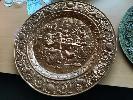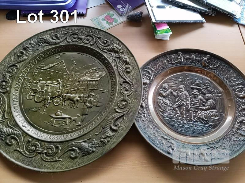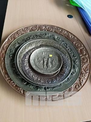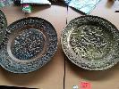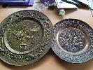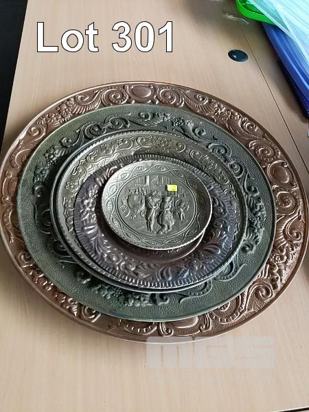 6 x COPPER AND BRASS WALL PLATES, SIZES LARGE TO SMALL.