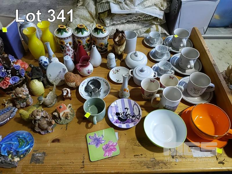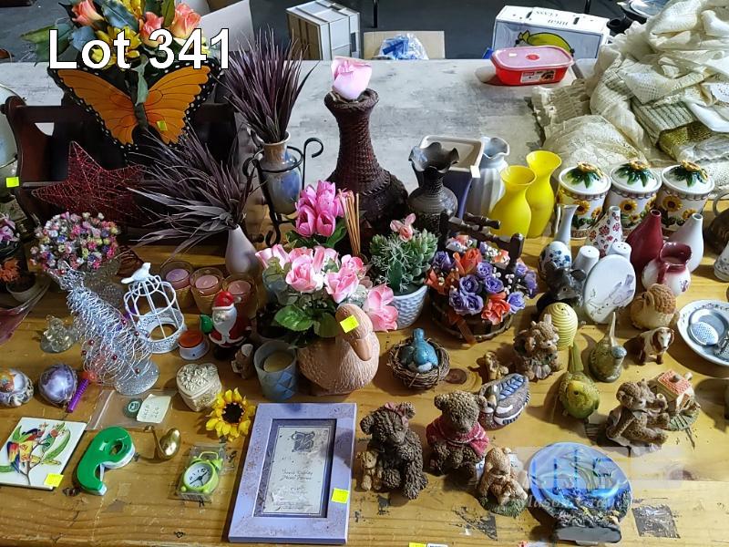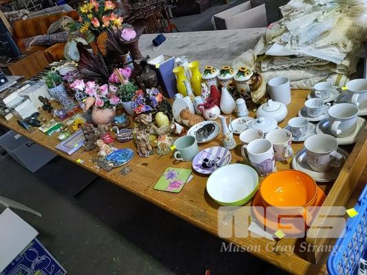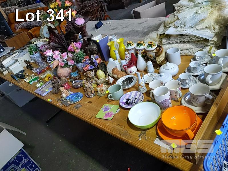 HOMEWARES, CONTEMPORARY NOVELS, KNICK-KNACKS, VASES, ARTIFICIAL FLOWERS, CUPS AND SAUCERS ETC (1x TABLE)