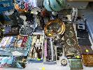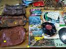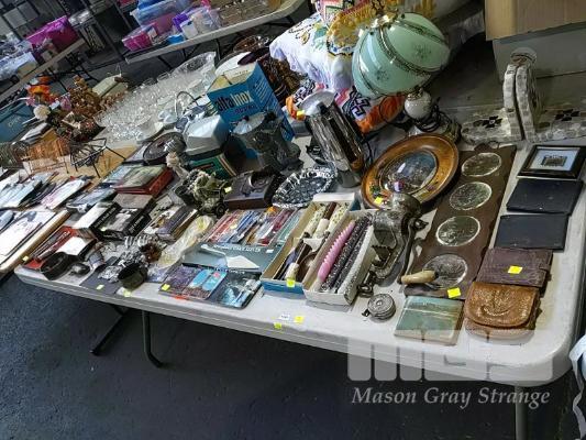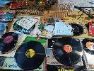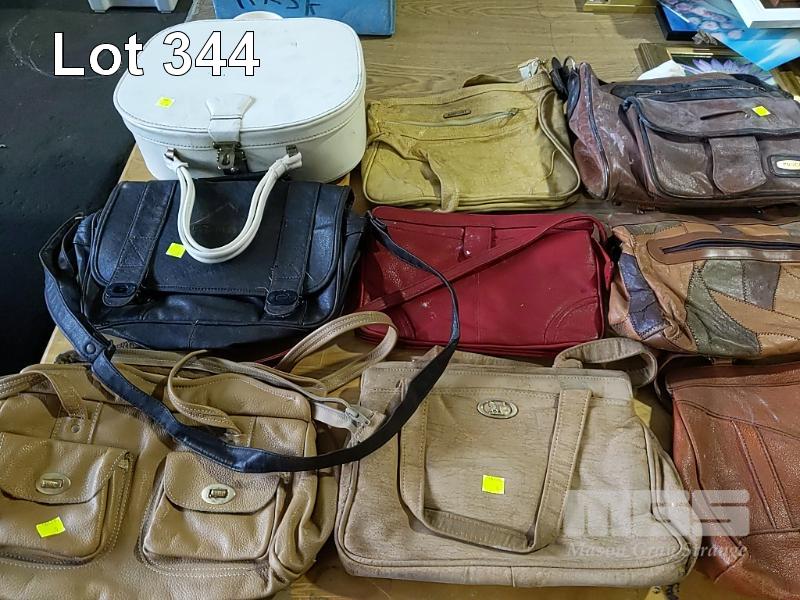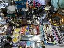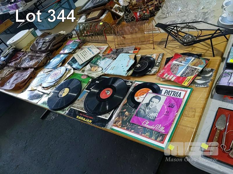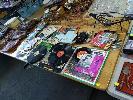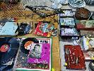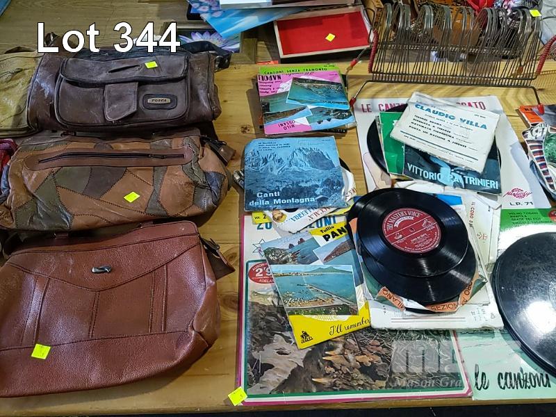 COLLECTION OF HOMEWARES, COLLECTABLES, OLD RECORDS AND HANDBAGS ET (2 x TABLES)
