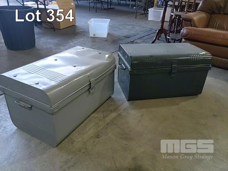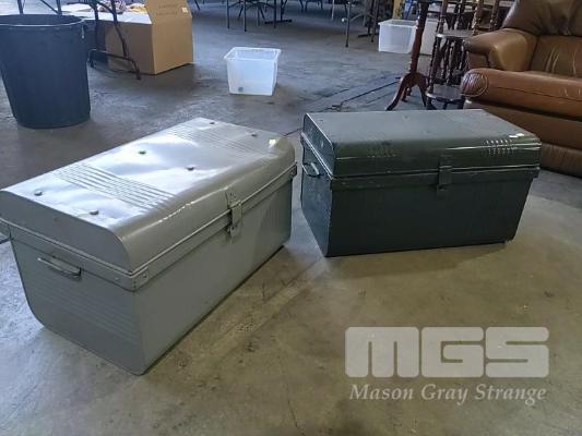 2 x VINTAGE LOCKABLE PRESSED METAL STORAGE CHESTS