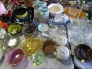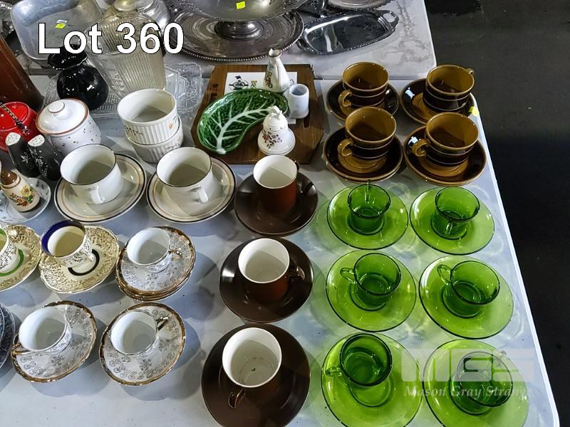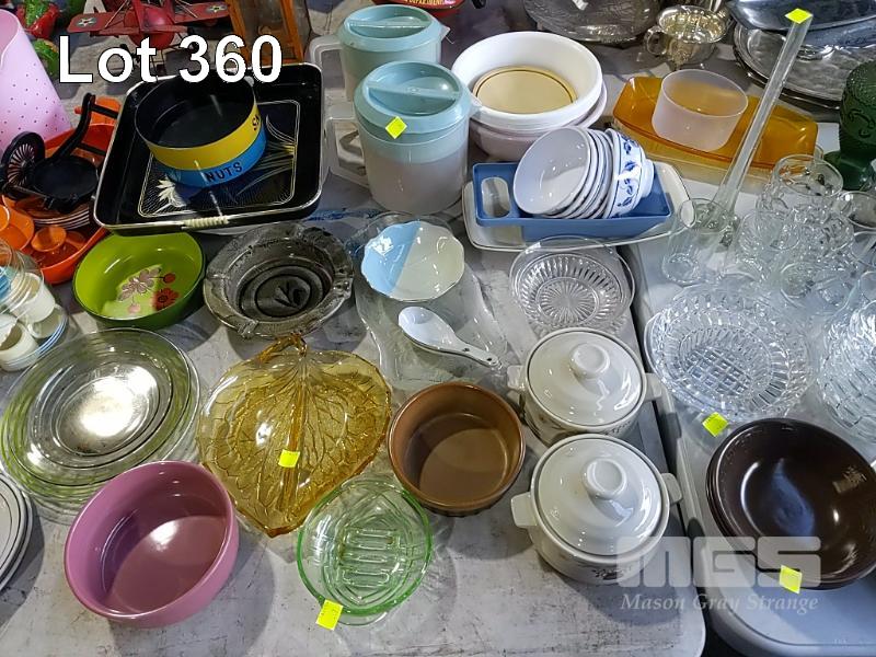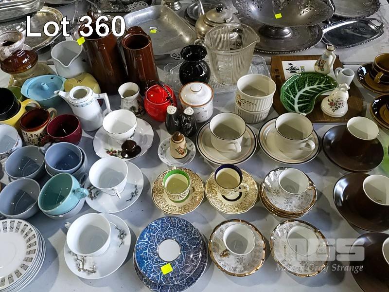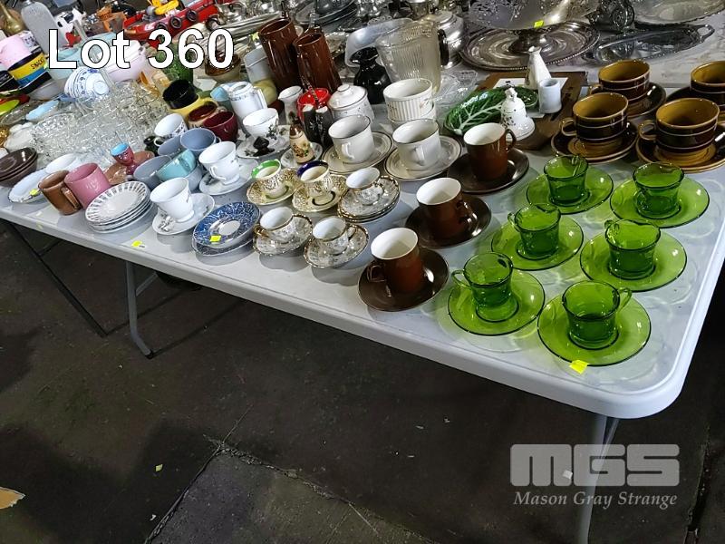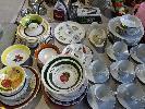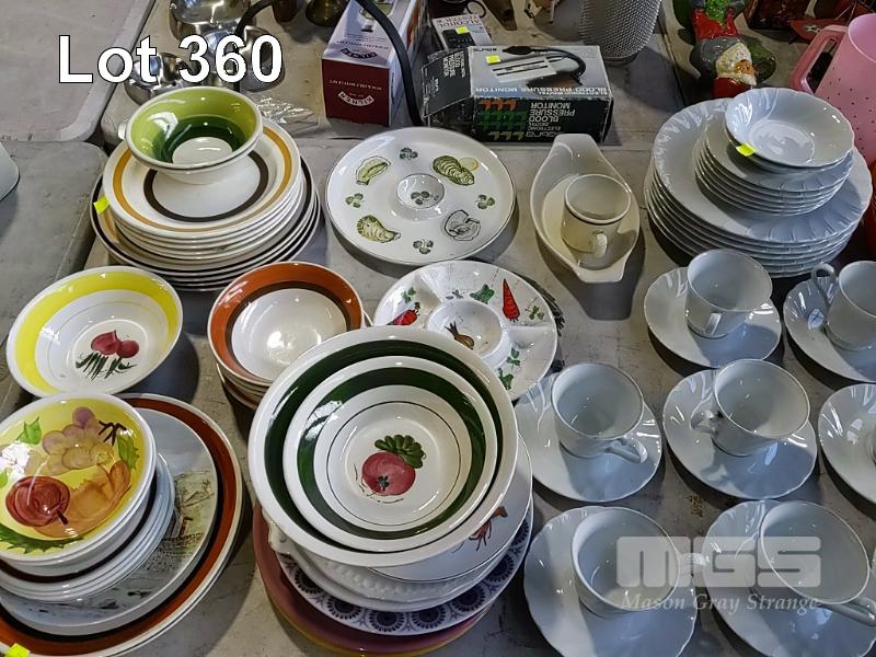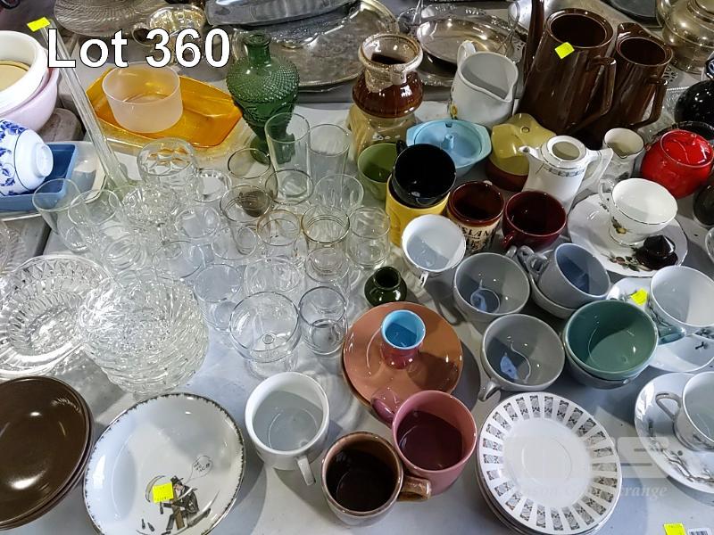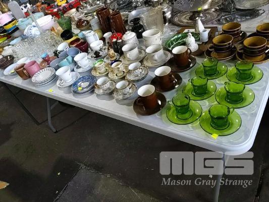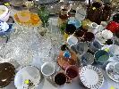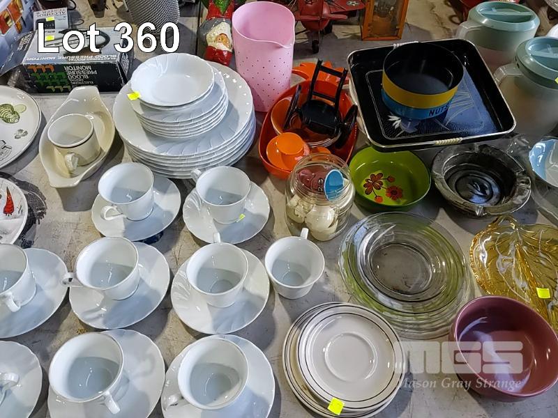 2 x TABLES OF ASSORTED CROCKERY, GLASSWARE, PLASTI-WARE AND OTHER TABLEWARE