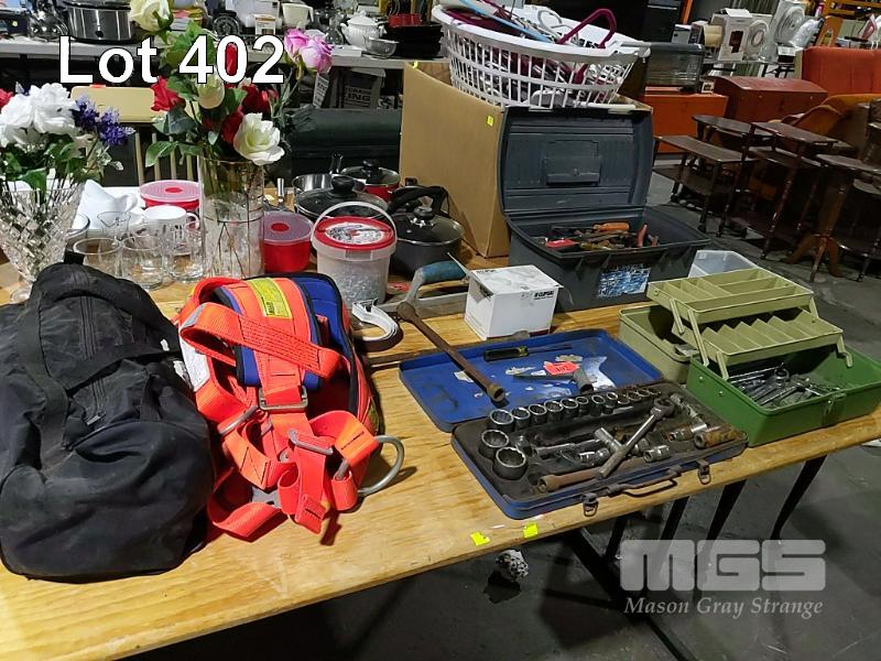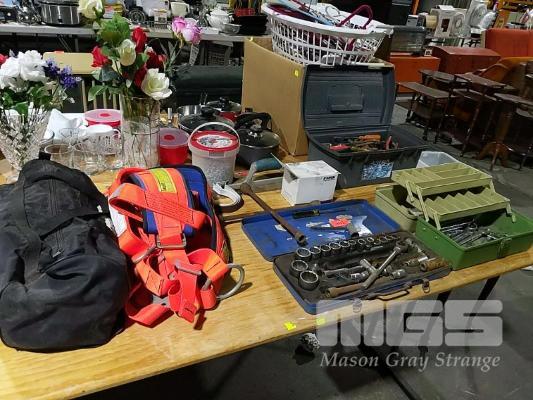 ASSORTED HAND TOOLS, SOCKET SET, FALL ARRESTOR HARNESS, (EXP 2016) & BUSHRANGER EXHAUST JACK