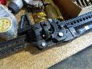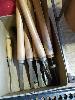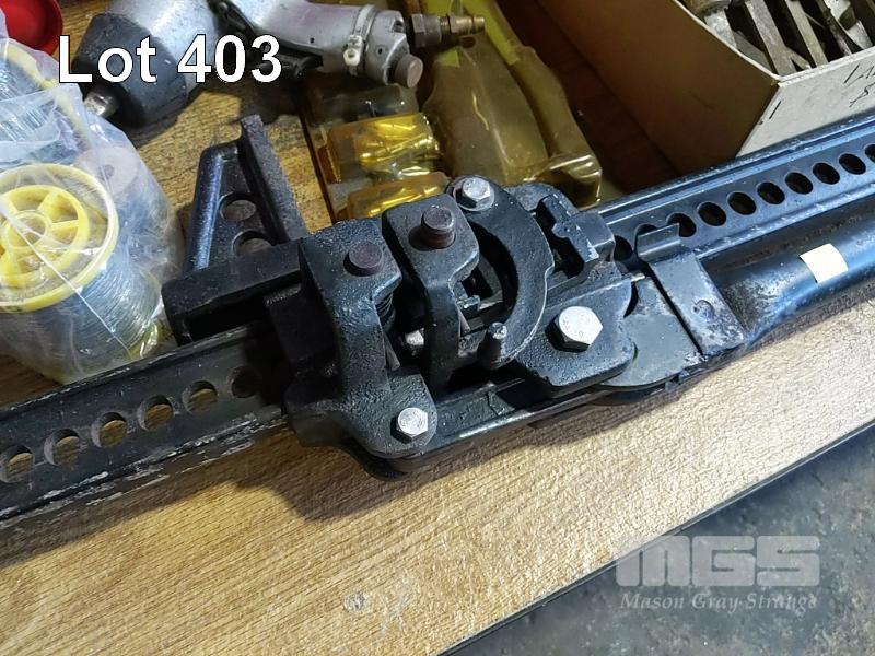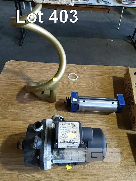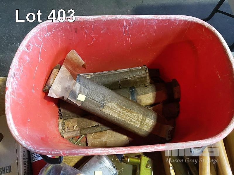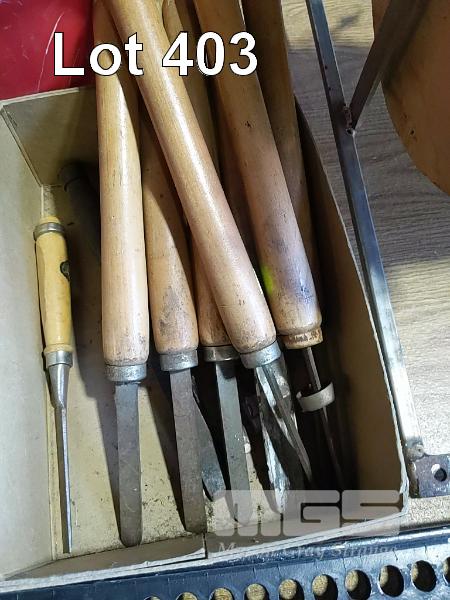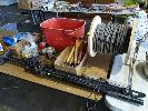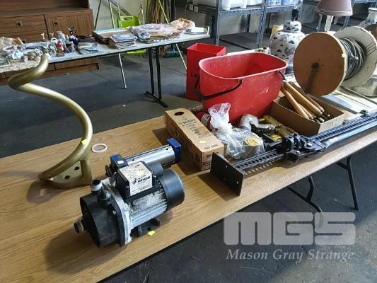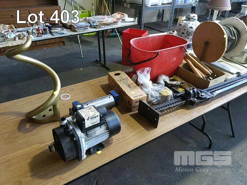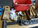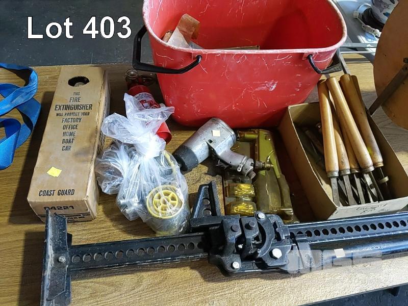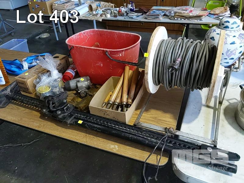 OLD WORKSHOP TOOLS AND MACHINE PARTS INCLUDING JACK, WOODTURNING GOUGES, PNEUMATIC IMPACT WRENCH, WELDING RODS, EXTENSION REEL ETC AND ONGA PUMP, MIXING WORM AND HEAVY DUTY MACHINE BLADE (1 x TABLE)
