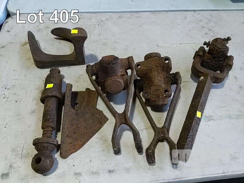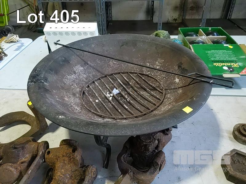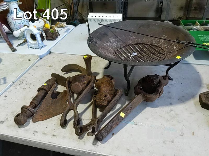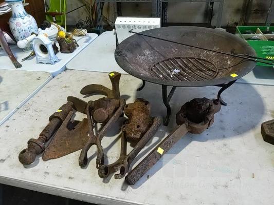 6 x RUSTY "FOUND" FARM OBJECTS AND METAL FIRE PIT
