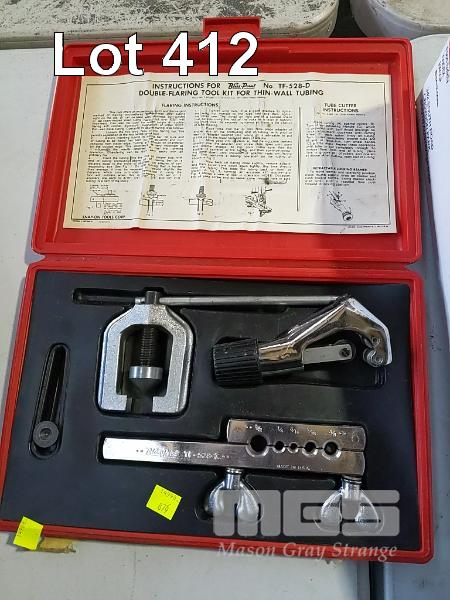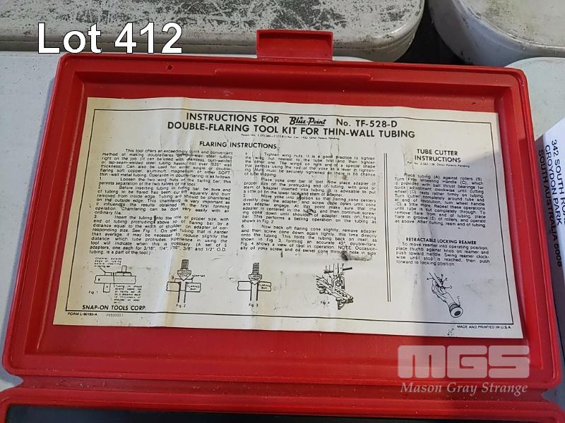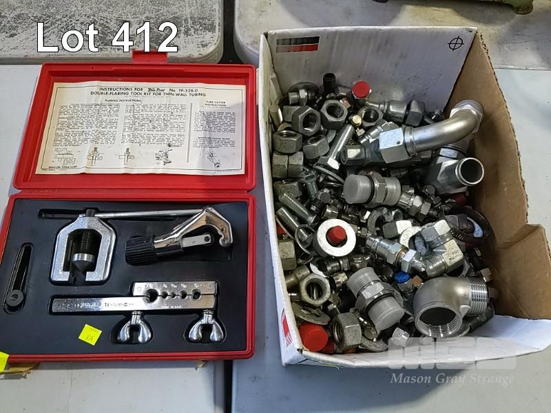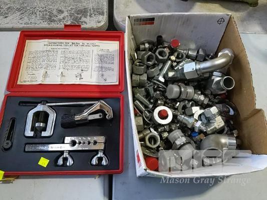 DOUBLE-FLARING TOOLKIT AND BOX OF GAS FITTINGS, NUTS AND BOLTS ETC