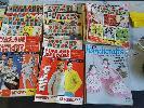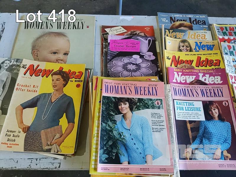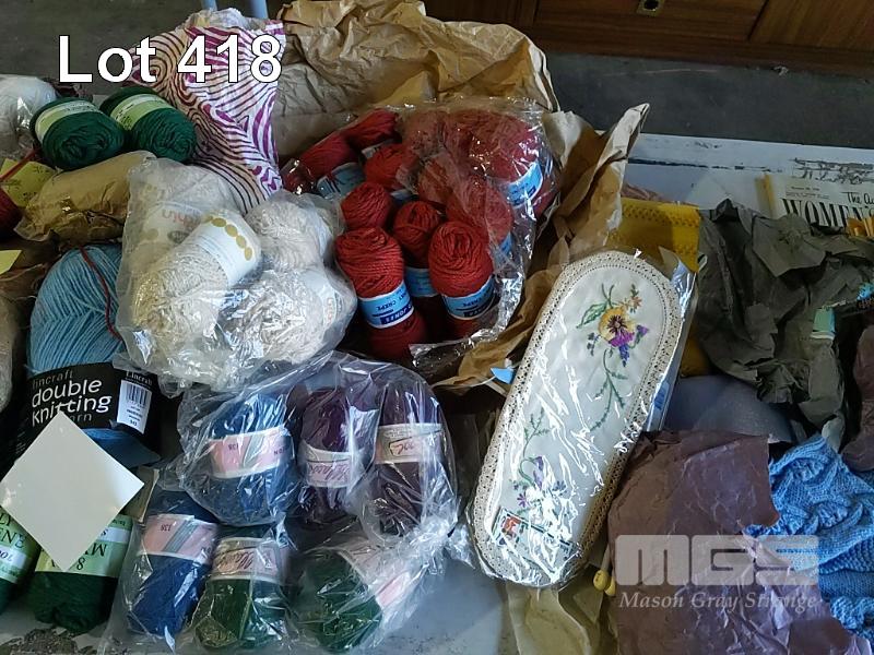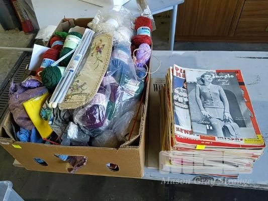 MID CENTURY VINTAGE SEWING AND KNITTING MAGAZINES AND QUANTITY OF KNITTING WOOL, CROCHET COTTON, NEEDLES, YARN & FABRICS FROM THE PERIOD.