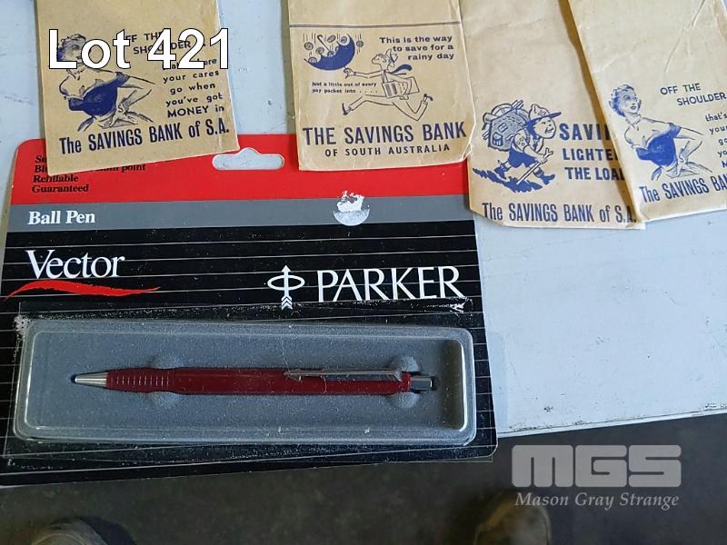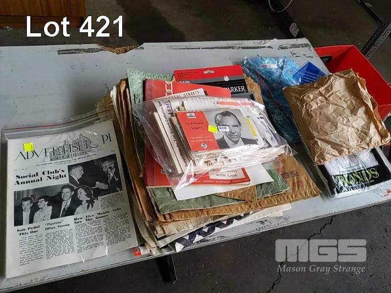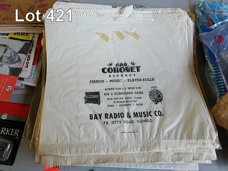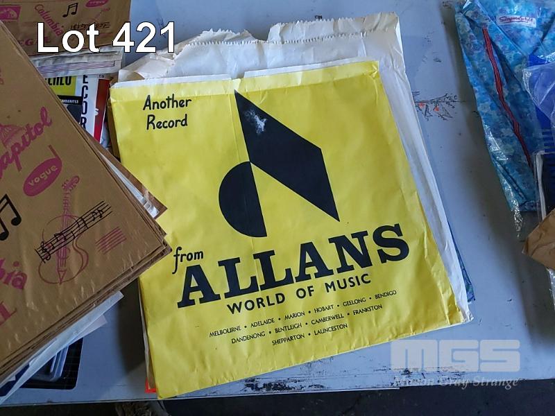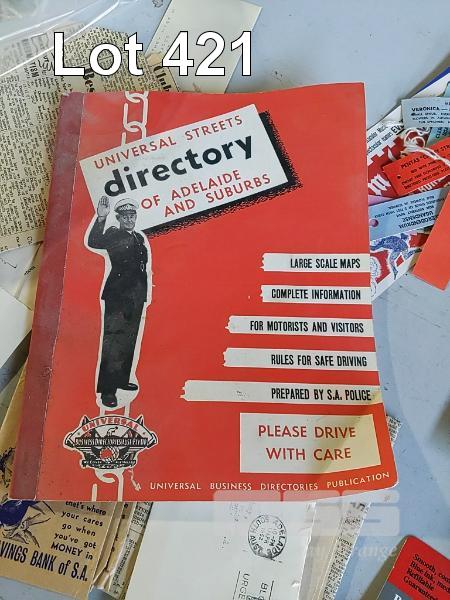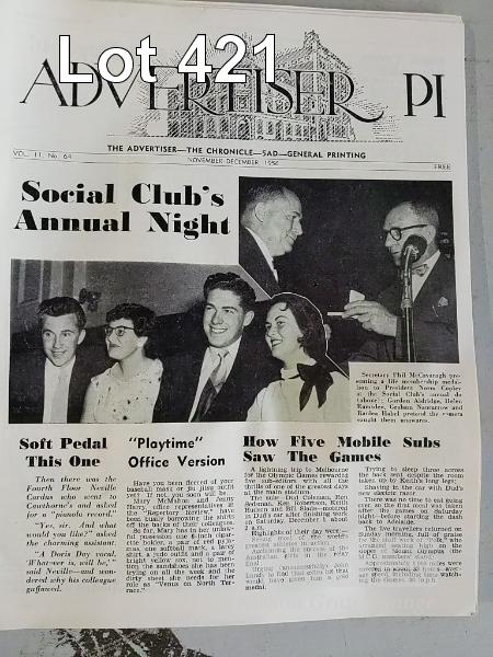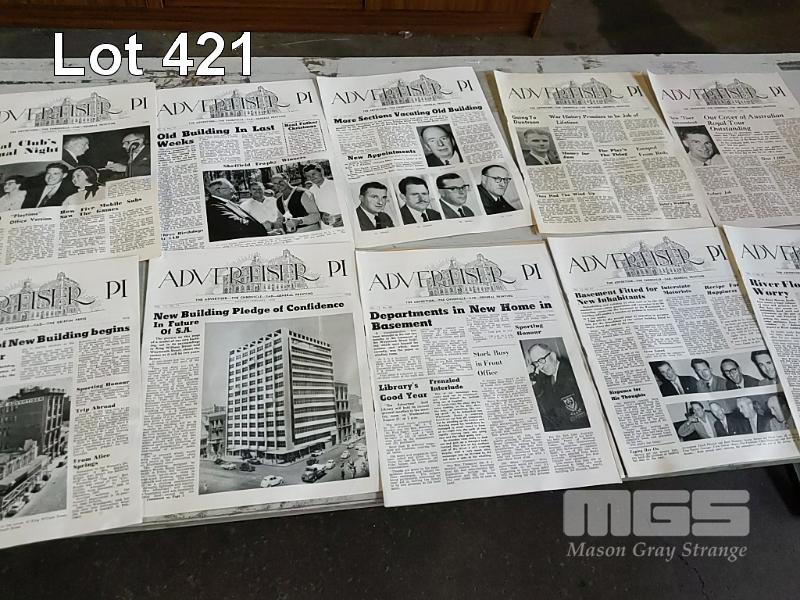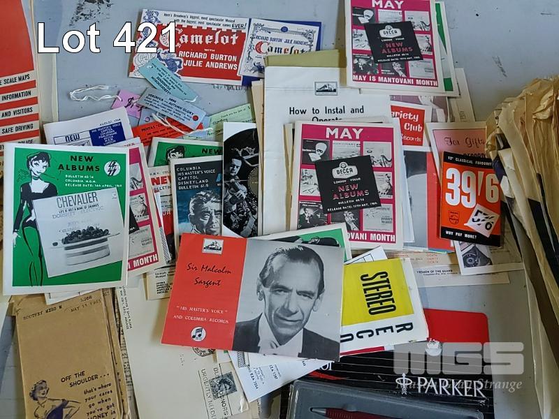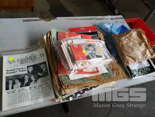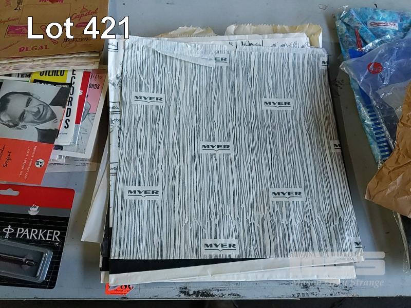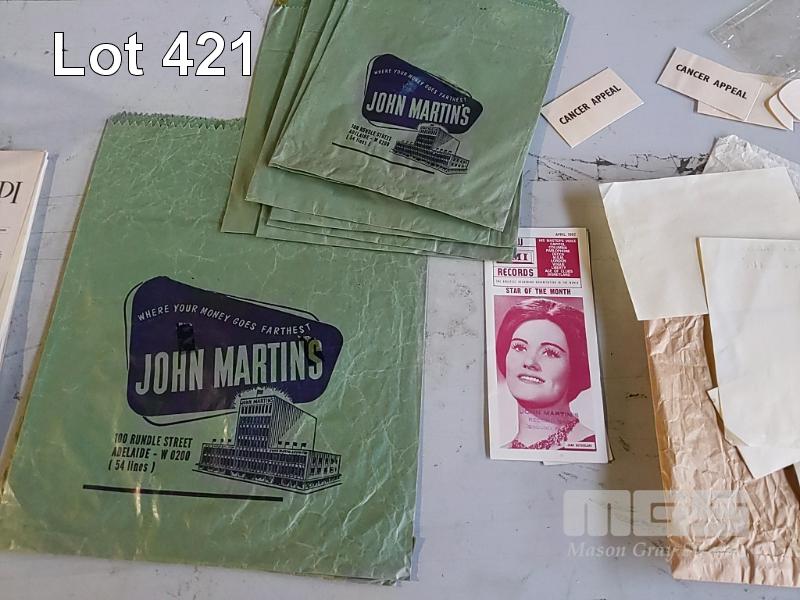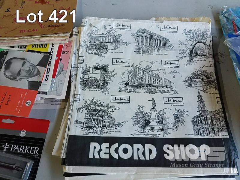 COLLECTION OF MID-CENTURY EPHEMERA INCLUDING THEATRE TICKETS, 2 x ITEMS OF OLD/NEW CLOTHING, QUANTITY OF PRINTED RECORD STORE PURCHASE WRAPPER BAGS FROM VARIOUS ADELAIDE RECORD STORES, RECORD STORE PROMOTIONAL MATERIALS FROM THE PERIOD, PARKER BALLPOINT PEN WITH ORIGINAL PACKAGING, ADELAIDE STREET DIRECTORY CIRCA 1961, SEVERAL COPIES OF THE "ADVERTISER PI" STAFF NEWSLETTER FOR THE ADVERTISER, THE CHRONICLE AND 5AD CIRCA 1956 AND MORE