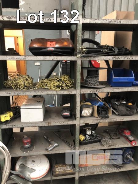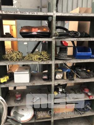 2 BAYS TOOLS, HOLE SAWS, AIR TOOLS, RETRACTABLE 240V CORD, 12V AIR COMPRESSOR, GAS STRUTS, PULLER, ETC