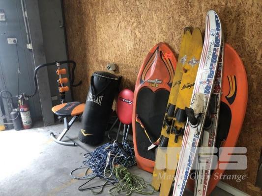 3 x SETS WATER SKIS & ROPE, 2 x WAKE BOARDS, PUNCHING BAG & 2 x EXERCISE SEATS