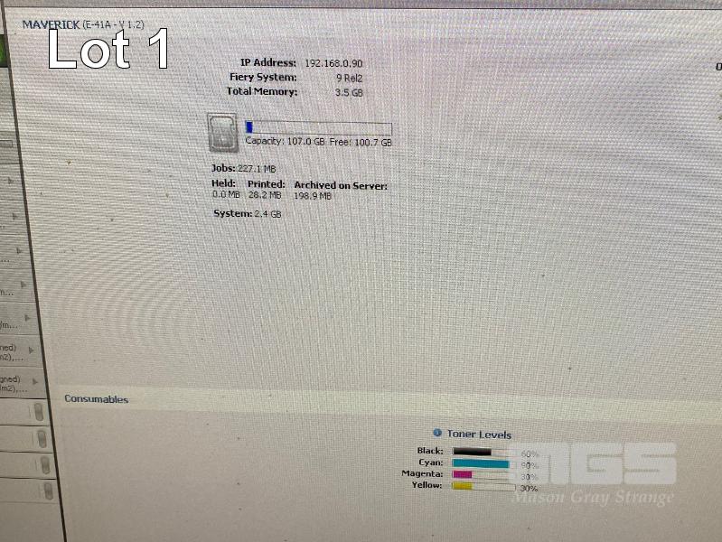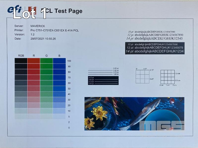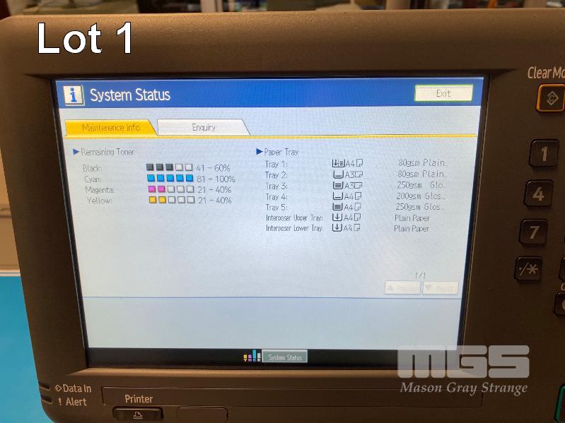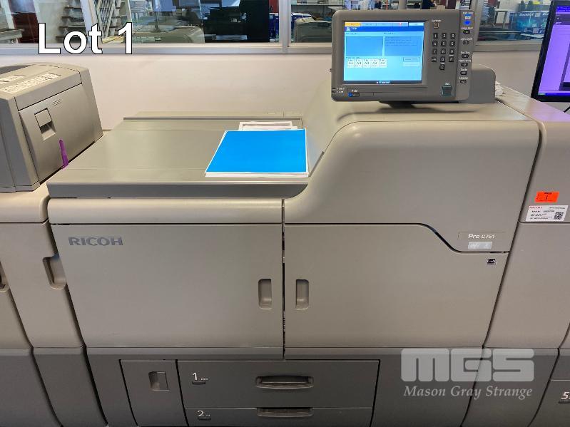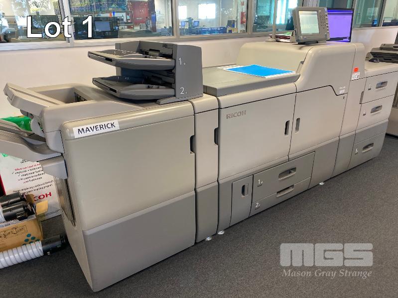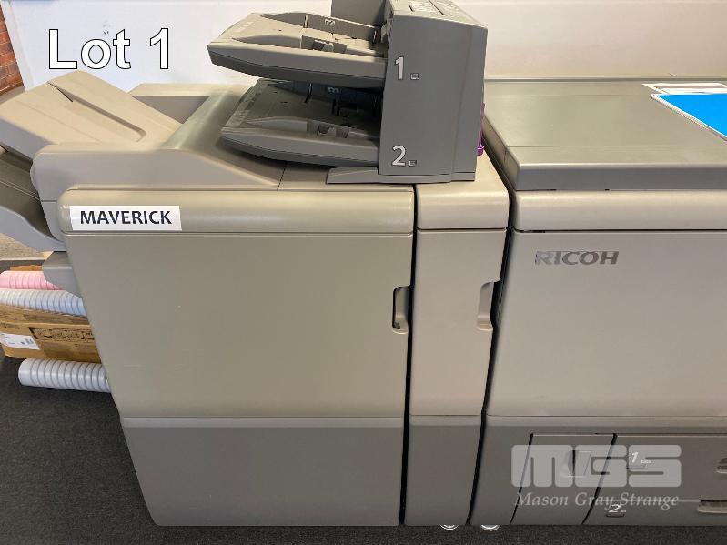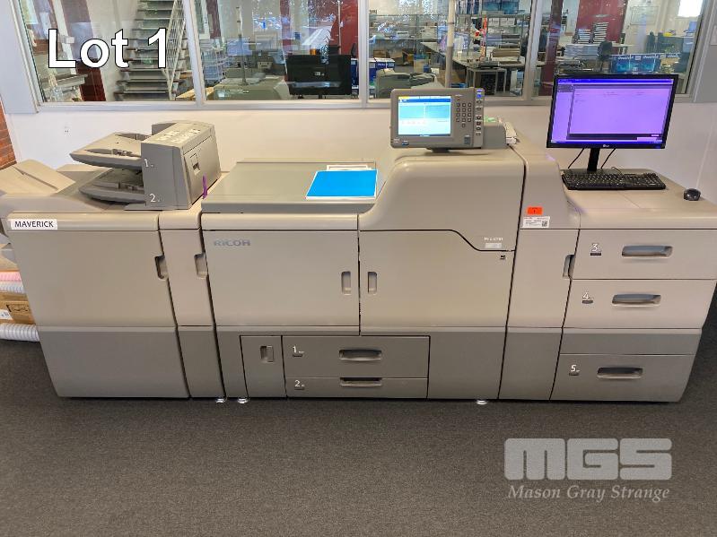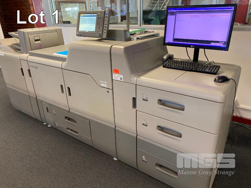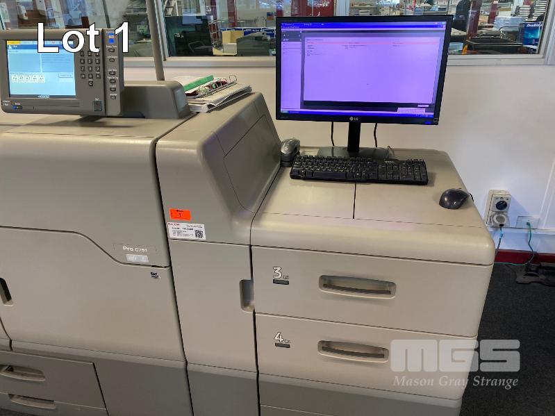 DIGITAL PRINTING PRESS, RICOH PRO C751 COLOUR, FINISHER SR5030, WIDE LARGE CAPACITY TRAY, PUNCH UNIT 2 & 4 HOLES, TWIN INTERPOSER, 15AMP POWER, FIERY E-41A COLOUR CONTROLLER, EFI ES-1000 COLOUR PROFILER, LCD MONITOR "MAVERICK" APPROX COPY COUNT - 3,140,750 COLOUR, 294,133 B&W (TEST PAGE ATTACHED) APPROX OVERALL DIMENSIONS - 320 x 145 x 95cm NOTES: ASSET LOCATED - SOUTH ROAD, EDWARDSTOWN SA INSPECTION & COLLECTION BY APPOINTMENT ONLY PURCHASER TO ARRANGE DECOMMISSIONING & COLLECTION BY 31/8/2021 S/N:S9820920008