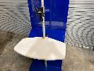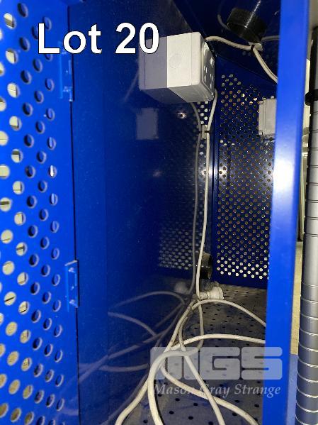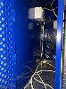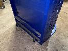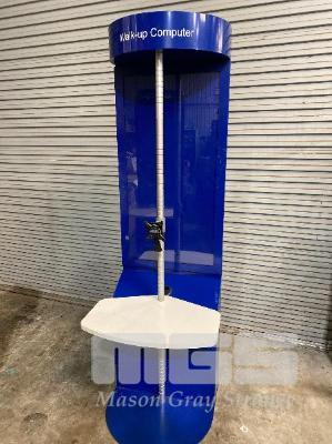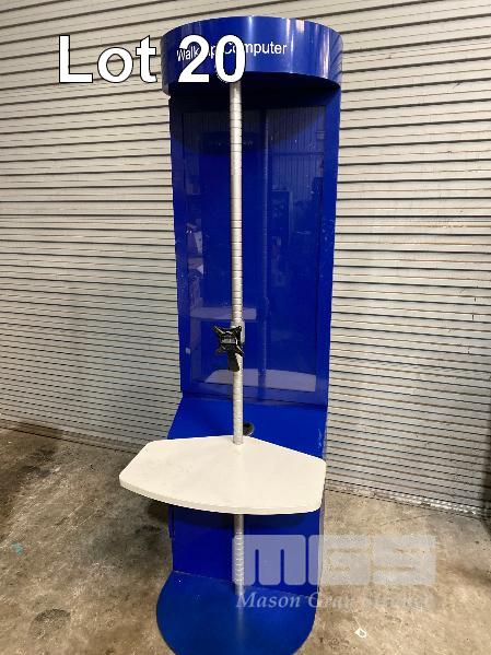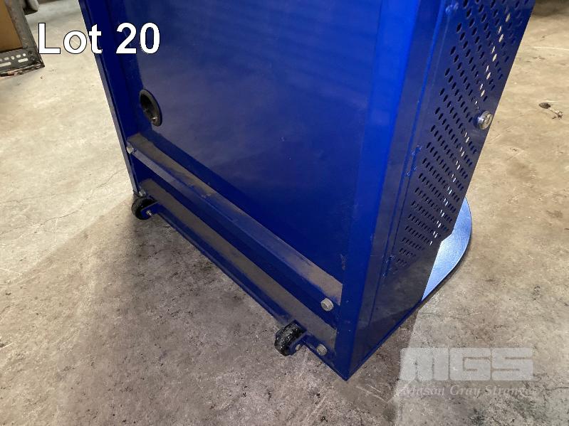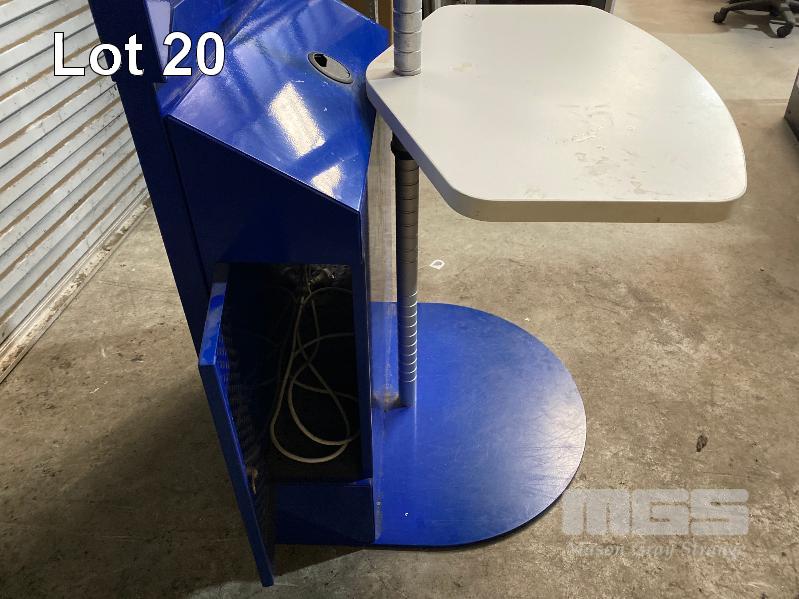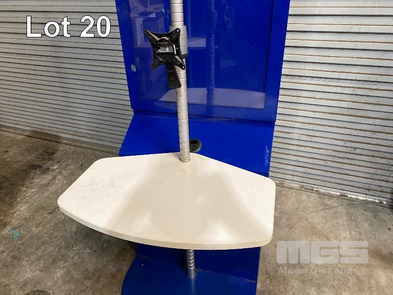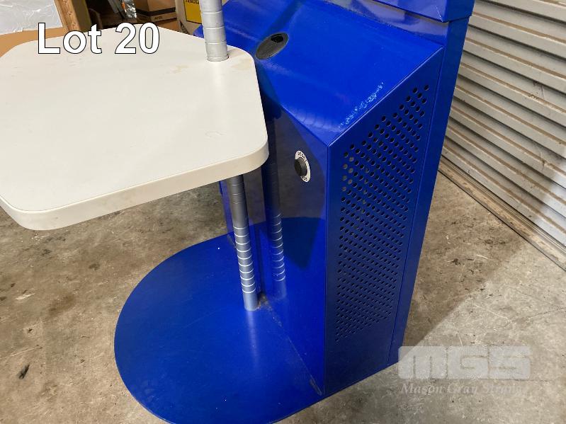 COMPUTER KIOSK STAND "WALK-UP COMPUTER", BLUE STEEL FRAME, WITH MONITOR BRACKET, STORAGE COMPARTMENT WITH KEY, 218cm HIGH x 65cm WIDE x 65cm DEEP