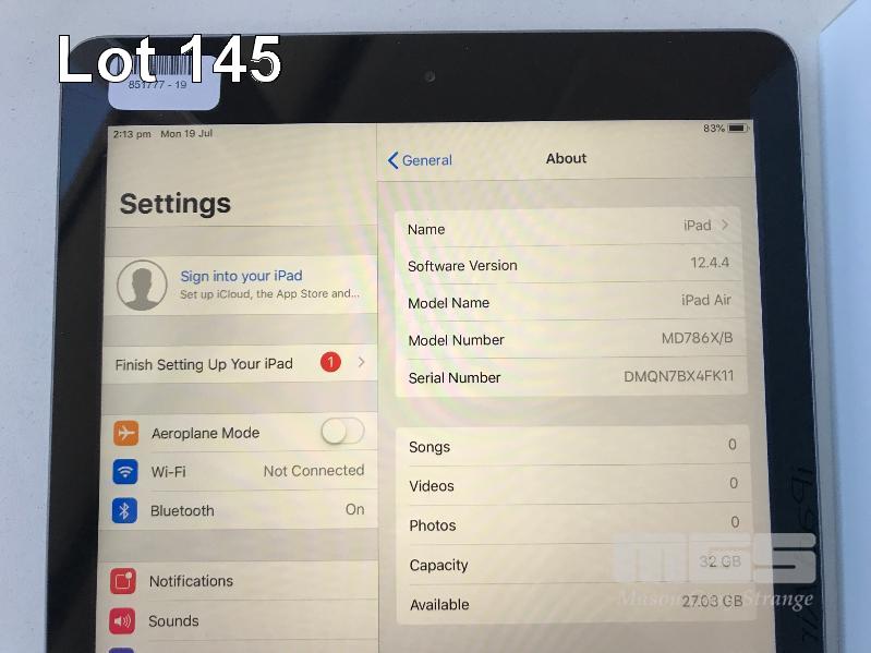 APPLE iPAD AIR, 32GB, Wi-Fi, SPACE GREY, MODEL A1474 WITH CABLE, CHARGER & COVER S/N:DMQN7BX4FK11