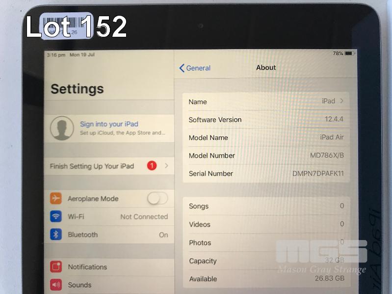 APPLE iPAD AIR, 32GB, Wi-Fi, SPACE GREY, MODEL A1474 WITH CABLE, CHARGER & COVER S/N:DMPN7DPAFK11