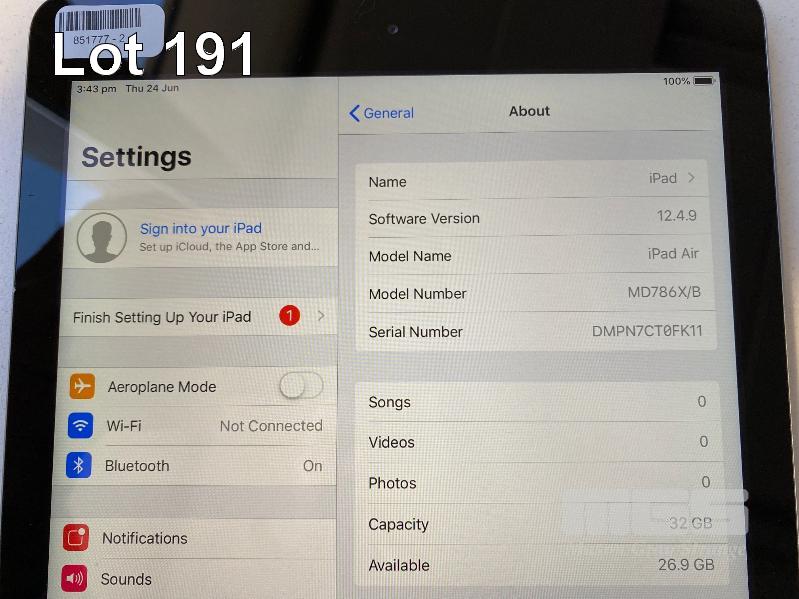 APPLE iPAD AIR, 32GB, Wi-Fi, SPACE GREY, MODEL A1474 WITH COVER (NO CHARGER, NO CABLE) S/N:DMPN7CT0FK11