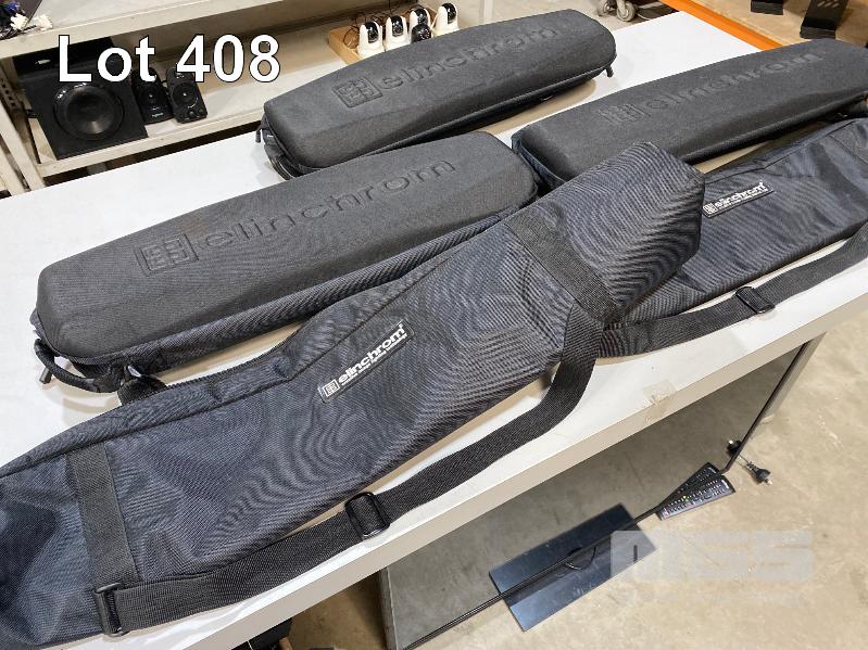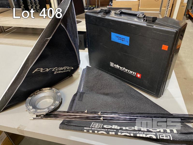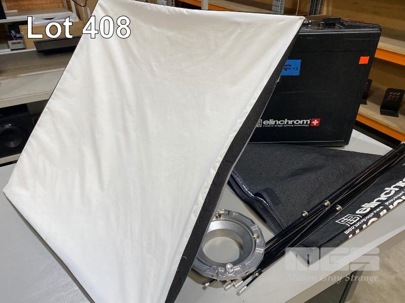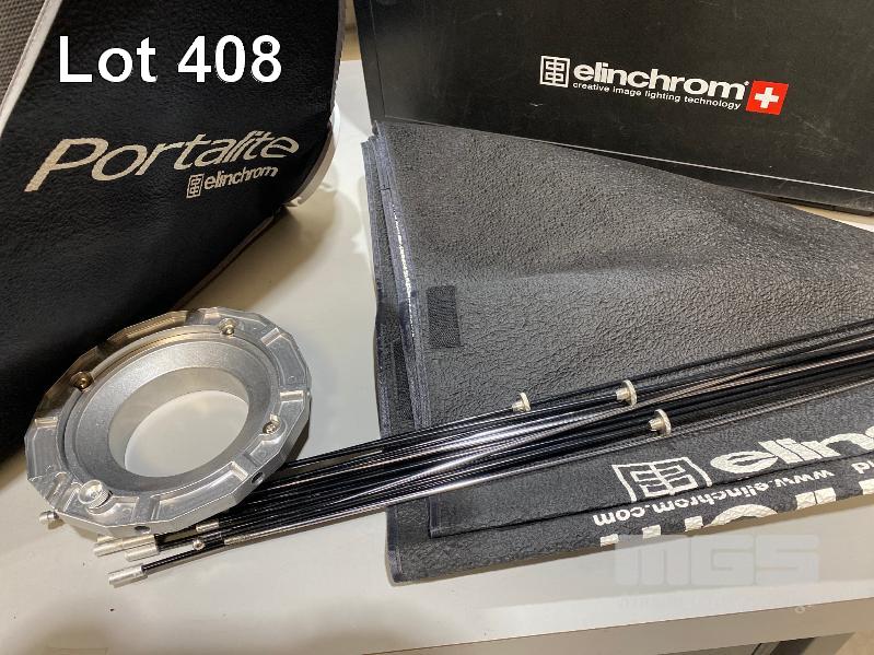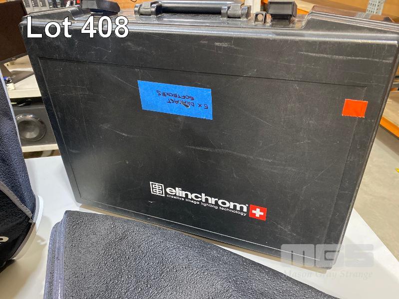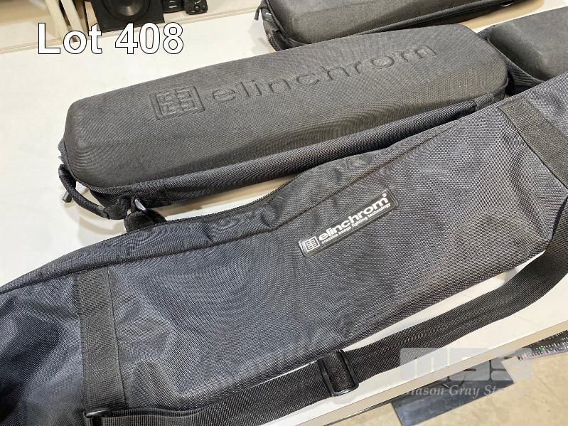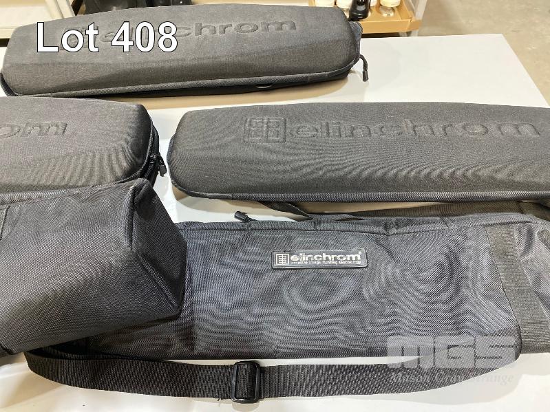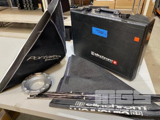 2 x ELINCHROM PORTALITE SQUARE SOFT BOXES, 65 x 65cm (1 x MISSING FRONT DIFUSER) WITH 1 x HARD CARRY CASE, 5 x ASST SOFT CARRY CASES
