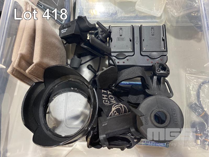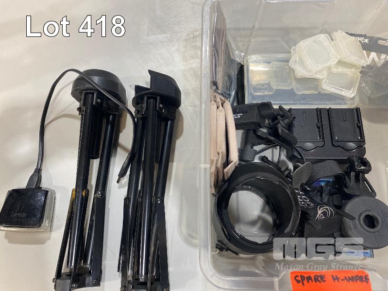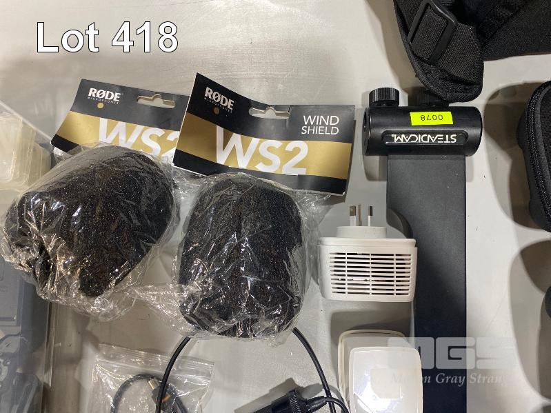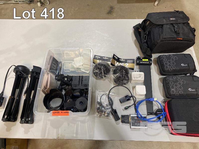 QTY ASST SPARE CAMERA PARTS, ACCESSORIES INC MEMORY CARD CASES, LOWPRO CAMERA CASES, CARD READER, RODE WIND SHIELDS, HDMI TO USB CONVERTER, NETGEAR Wi-Fi RANGE EXTENDER