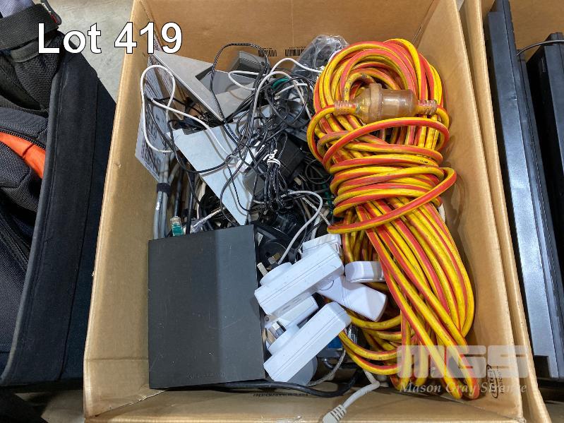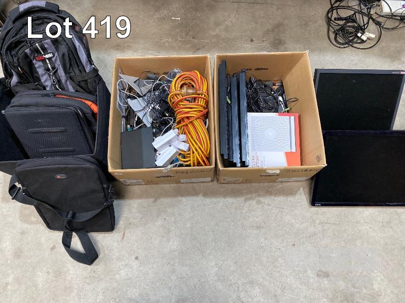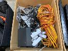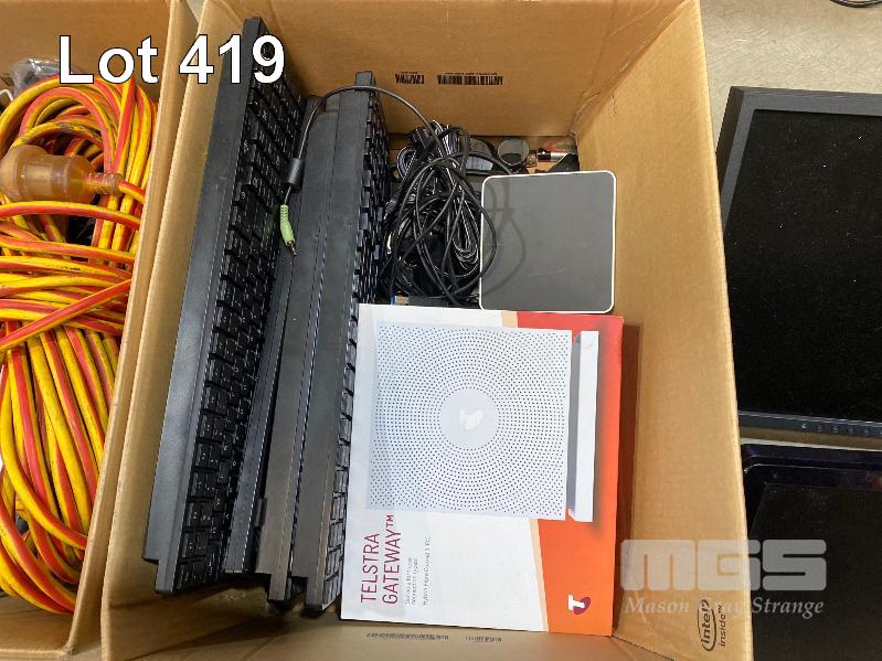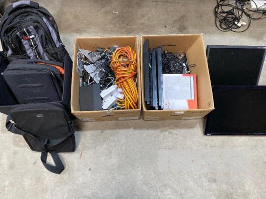3 x BOXES ASST COMPUTER SUNDRIES INC CARRY BAGS, EXTENSION LEAD, CABLES, KEYBOARDS, MODEM, 17" MONITOR ETC