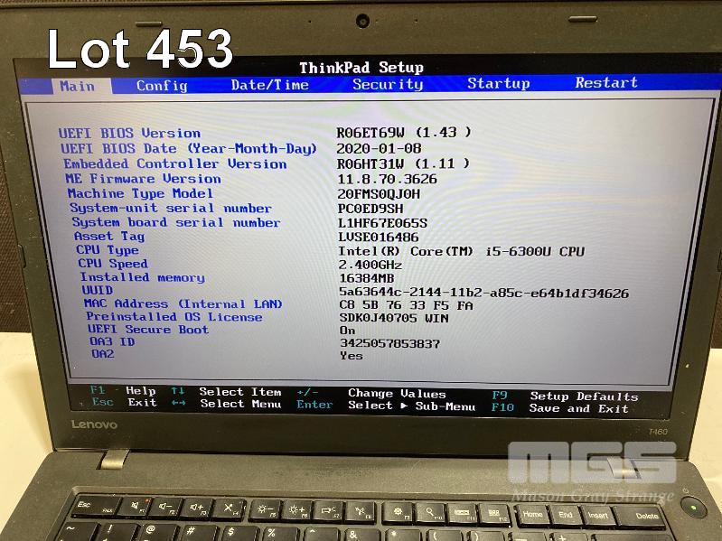 LAPTOP, LENOVO THINKPAD T460 (20FMS0QJ0H), CORE i5 6300U (6TH GEN) @ 2.4GHz, 16GB DDR3 RAM, 275GB SSD, 14" WIDESCREEN (1920x1080), INTEL HD VIDEO, Wi-Fi, BLUETOOTH, WINDOWS 10 PRO INSTALLED & POWER SUPPLY (NOTE: MARKS ON SCREEN) S/N:PC0ED9SH