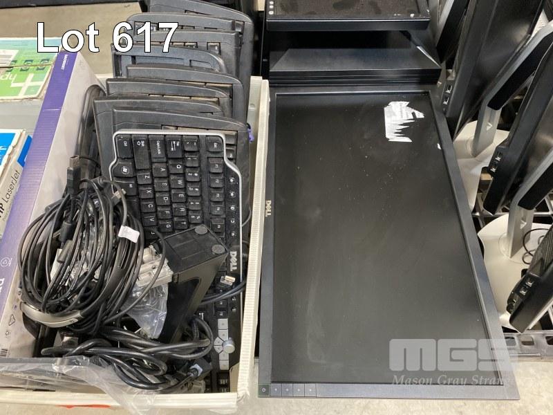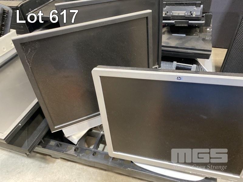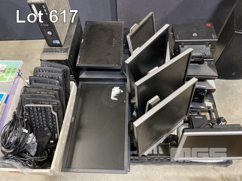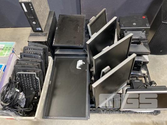 PALLET LOT ASST LCD MONITORS (MOST NO STANDS), 2 x COMPUTERS, BOX ASST KEYBOARDS (NO CABLES)