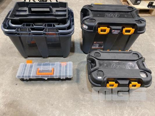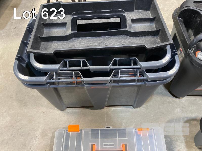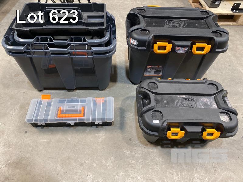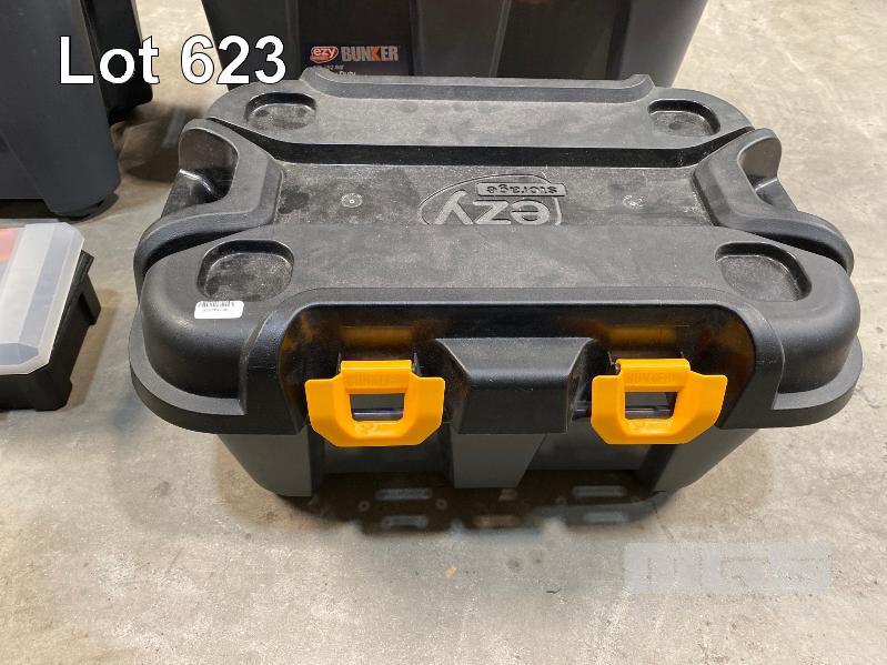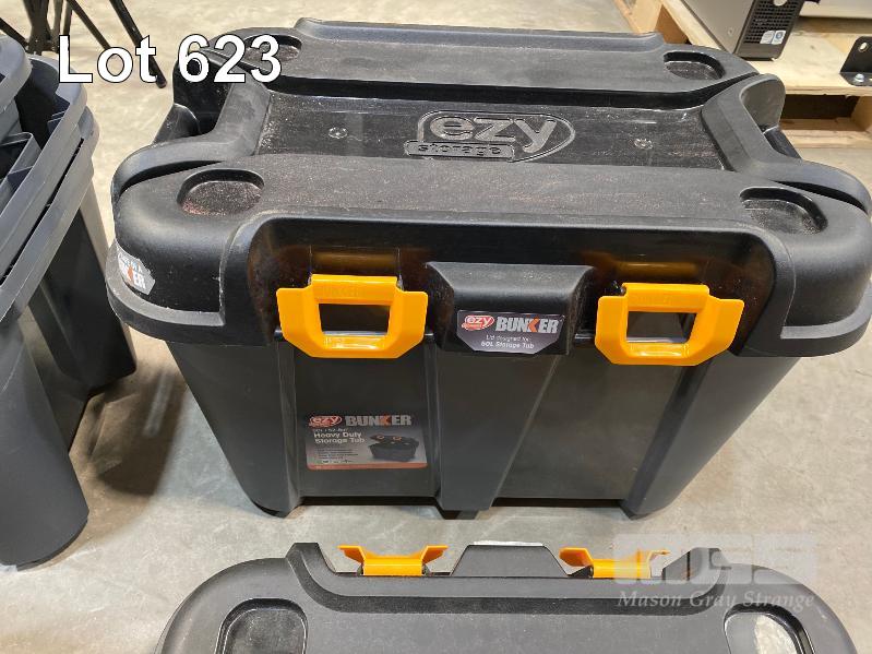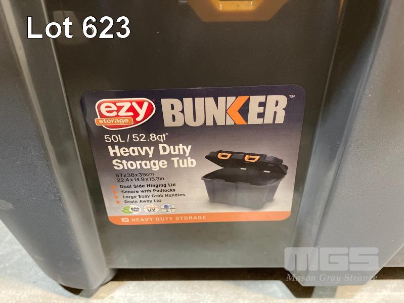 5 x EZY STORAGE BUNKER HEAVY DUTY STORAGE TUBS, 50L & 20L (NOTE: 3 x MISSING LIDS)