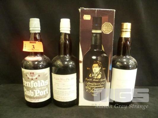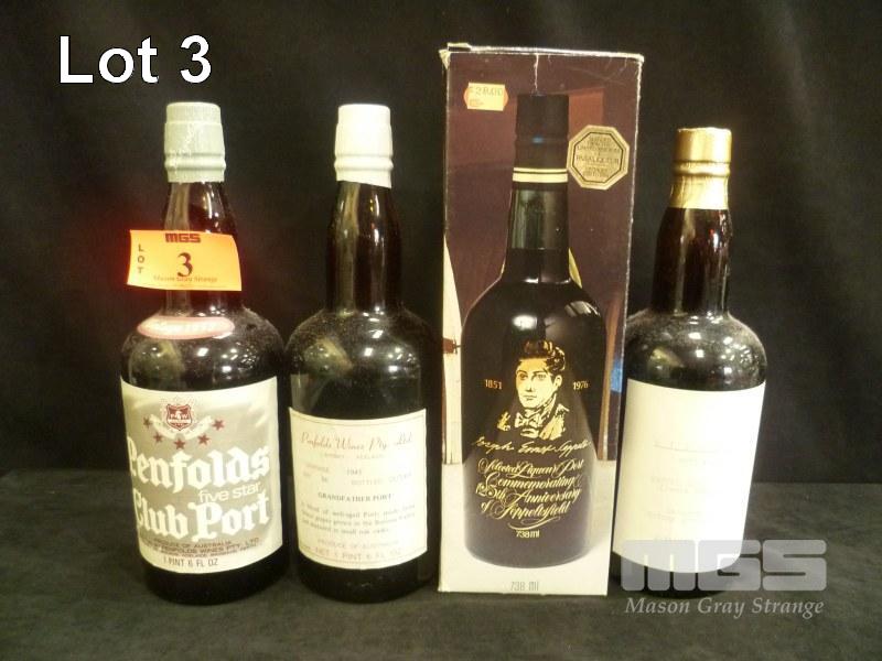 4 x BOTTLES VINTAGE PORT, INC VINTAGE 1953 PENFOLDS CLUB PORT, VINTAGE 1945 PENFOLDS GRANDFATHER PORT, 1976 COMMEMORATING 125TH ANNIVERSARY OF SEPPELTSFIELD & WILSFORD 1972 VINTAGE MATURE SWEET SHERRY (PEDRO PALOMINO)
