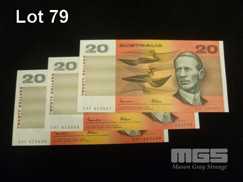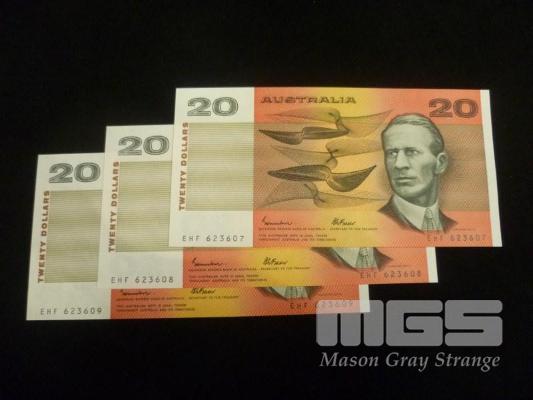 1985 3 x $20.00 NOTES CONSECUTIVE FRAZER JOHNSTON UNC