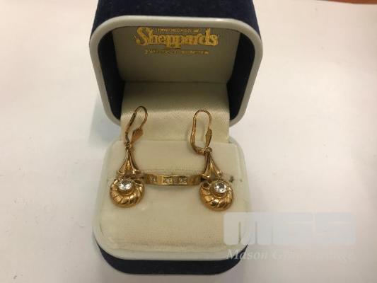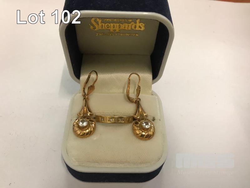 GOLD RING WITH 3 X SMALL DIAMONDS MARKED 18CT, PAIR OF EARRINGS WITH CLEAR STONES MARKED 18CT
