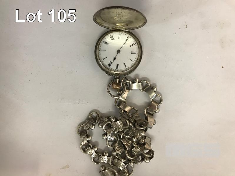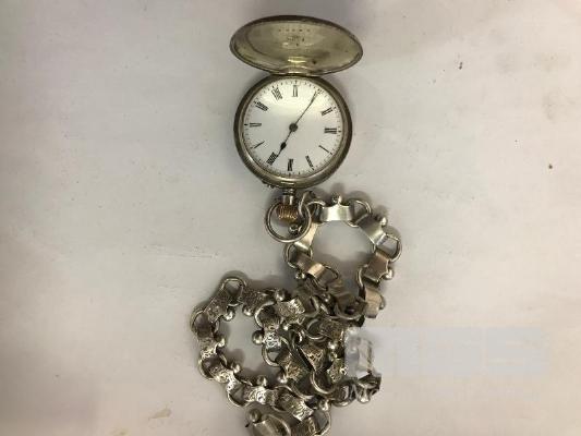 STERLING SILVER CASED POCKET WATCH WITH STERLING SILVER CHAIN, BRAND UNKNOWN, TICKS WHEN WOUND, 72 GMS TOTAL WEIGHT