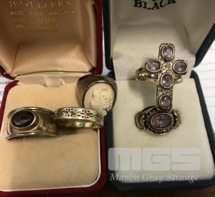 5 X STERLING SILVER RINGS, 4 X SET WITH AMATHYST, 1 X CAMEO 28.5 GMS