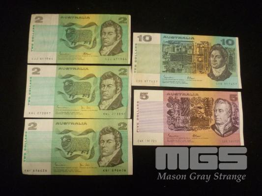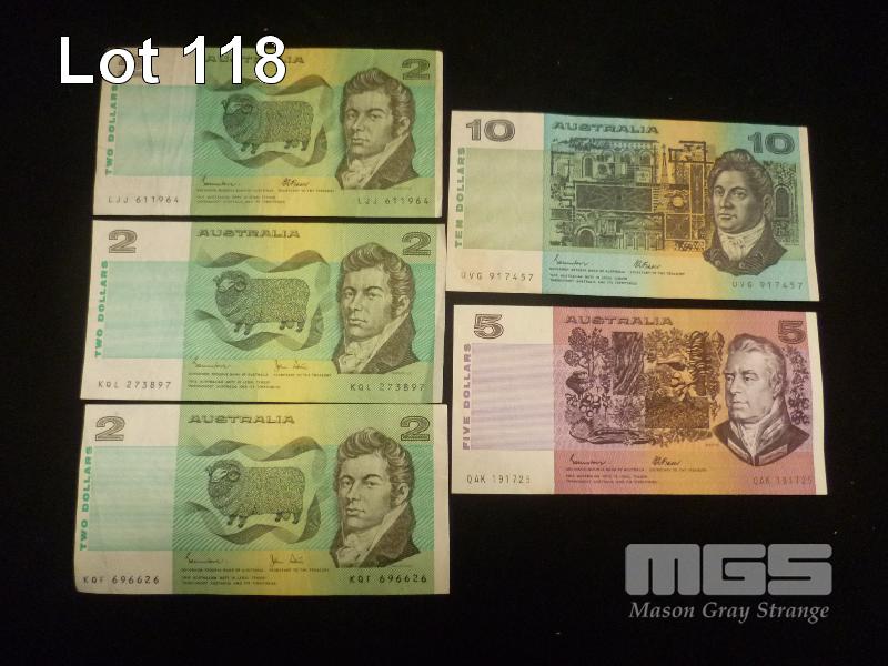 5 X AUSTRALIAN PAPER BANKNOTES 3 X 2 DOLLAR 1 X JOHNSTON/FRASER 2 X JOHNSTON/STONE, 1 X 5 DOLLAR JOHNSTON/FRASER, 1 X TEN DOLLAR JOHNSTON/FRASER