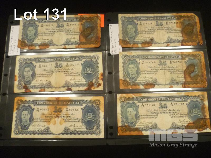 6 X AUSTRALIAN FIVE POUND BANKNOTES, 3 X COOMBES/WATTS, 3 X ARMITAGE/McFARLANE R PREFIXES, RUST STAINING DAMAGE