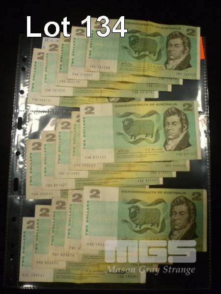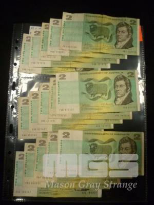 15 X AUSTRALIAN TWO DOLLAR PAPER BANKNOTES, PHILLIPS/RANDALL, F PREFIXES