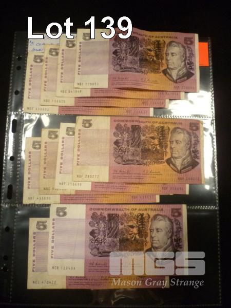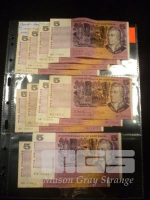 10 X AUSTRALIAN FIVE DOLLAR PAPER BANKNOTES, COOMBES/RANDALL, N PREFIXES