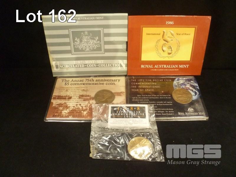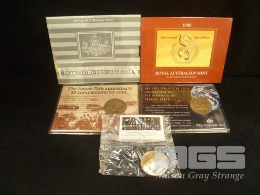 5 X ASSORTED COMMEMORATIVE COINS 3 X 5 DOLLAR COINS, 1988 PARLIAMENT HOUSE, 1990 SIMPSON & HIS DONKEY, 1992,YEAR OF SPACE, 1986 YEAR OF PEACE DOLLAR COIN & 1987 MINT SET